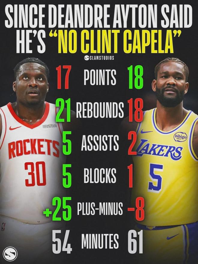 无论是以前打首发,还是如今在火箭打替补,卡佩拉一直兢兢业业。艾顿这番话,被诺维斯基等NBA名宿批评。快船记者Justin Russo写道:“海斯对湖人的重要性超过艾顿,我觉得湖人该让海耶斯首发,但这可能会摧毁艾顿的信心!”