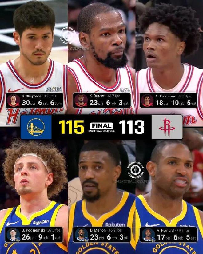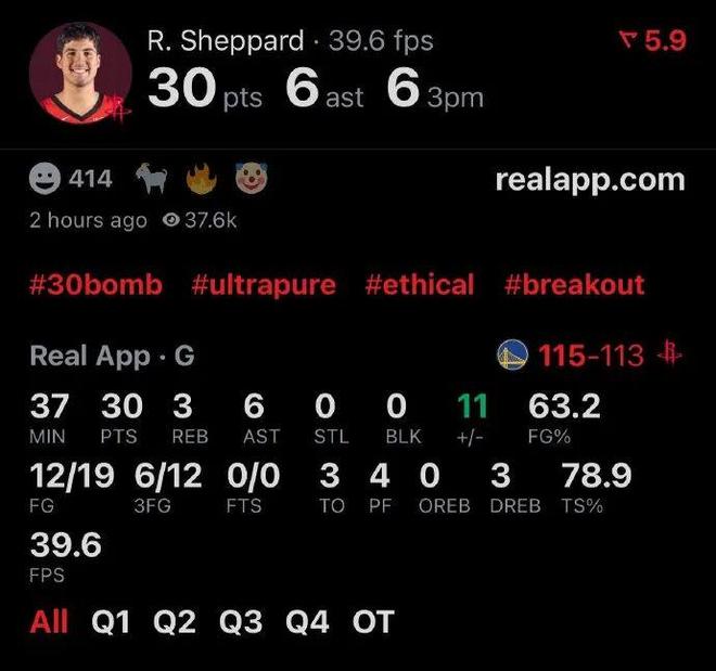 他替补出战37分钟,虽然防守被打爆,进攻也打爆了勇士,投篮19中12,三分12中6,火力全开,射下了全队最高的30分,还有3篮板6助攻。